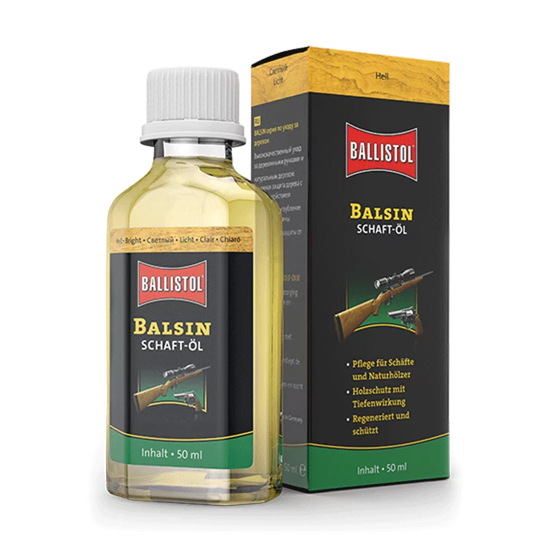 Balsin Schaftöl gibt auch alten, spröden und verwitterten Holzschäften wieder feinen seidenmatten Glanz. Macht das Holz wasserabstoßend, schützt vor Fäulnis und Schimmelbefall. Vertieft die Maserung, verstärkt die Widerstandskraft gegen Witterungseinflüsse durch eine besondere Silikonformulierung. Verhindert das Rau- und Fleckigwerden. Balsin Schaftöl ist das ideale Pflegemittel für Gewehrschäfte aus Nussbaum und anderen Naturhölzern. Auch ideal für unlackierte Möbel.