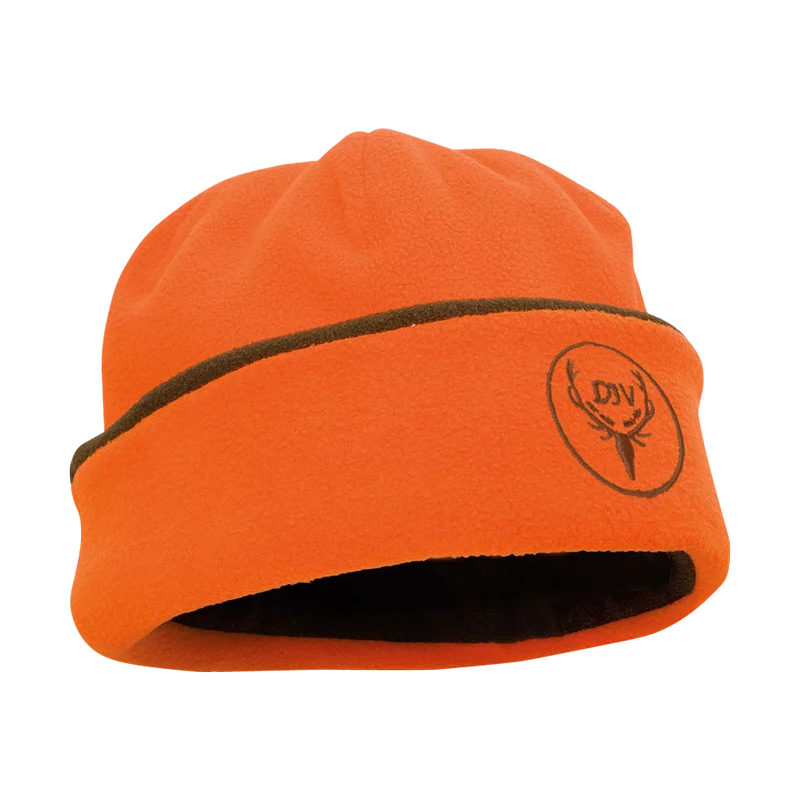 Warme und praktische Fleece-Wendemütze mit einer oliv-grünen und einer signal-orangen Seite.