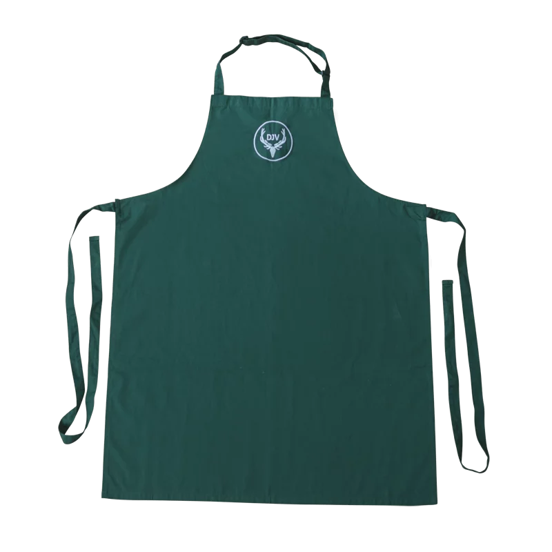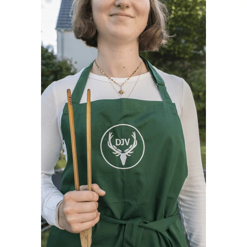 Wenn es ums Kochen und Grillen geht, ist eine Schürze unerlässlich. Die DJV-Grillschürze ist ein stylischer Fleckenschutz im schlichten Design und ist mit einem verstellbaren Halsband auf alle Körpergrößen einstellbar. Das gestickte DJV-Logo in Gold oder Silber wirkt sehr wertig auf der waldgrünen Schürze. Pflegeleichtes Baumwollmischgewebe, problemlos waschbar.