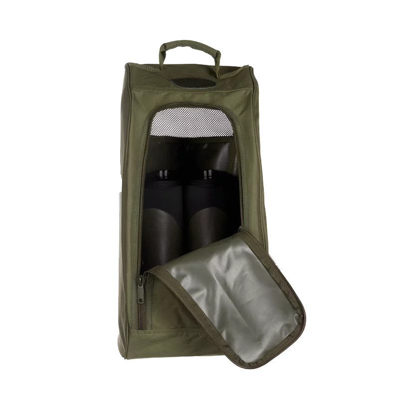 Geeignet für alle Jagdstiefel bis zu einer Schafthöhe von 53 cm. Kann bei Nichtgebrauch klein zusammengefaltet werden. Die Tasche ist mit einem praktischen Tragebügel an der Oberseite ausgestattet sowie einem Lüftungsnetz an der Rückseite, das für ausreichende Belüftung der Stiefel auch bei geschlossener Tasche sorgt. Mit dem umlaufenden Zwei-Wege-Reissverschluss kann die große Deckelklappe geöffnet werden und ermöglicht ein einfaches Einpacken der Stiefel. Das DJV-Logo ist als Leder-Applikatin auf der Oberseite der Tasche angebracht.