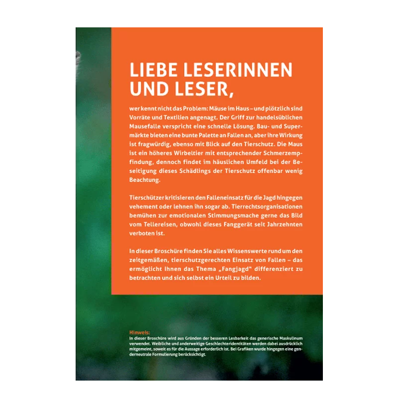 Die DJV-Broschüre „Wissenswertes zur Fangjagd in Deutschland“ zeigt wie heute tierschutzgerechter Einsatz von Fallen möglich ist. Es wird ein guter Überblick über Anwendungsbereiche von Fallen, gängige Fangsysteme und gesetzliche Grundlagen gegeben. Weiterhin sind Hinweise für die Praxis enthalten und es werden Optionen zur Balgverwertung aufgezeigt.