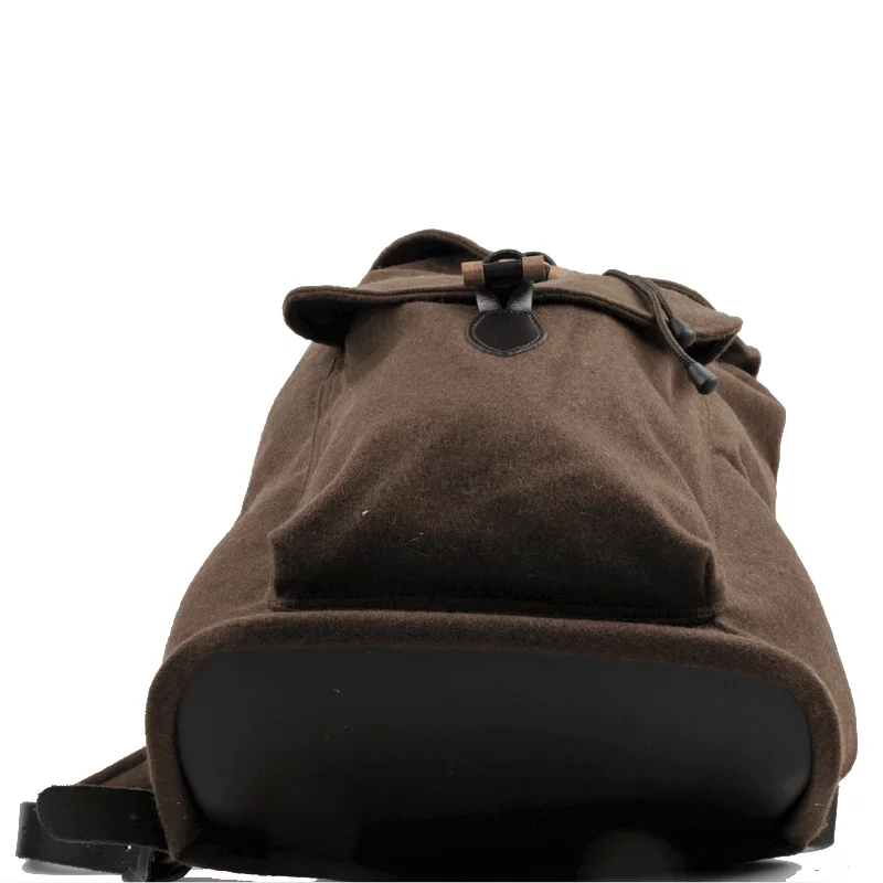 - Material: dunkelbrauner Lodenstoff, Ledertrageriemen und Lederapplikationen