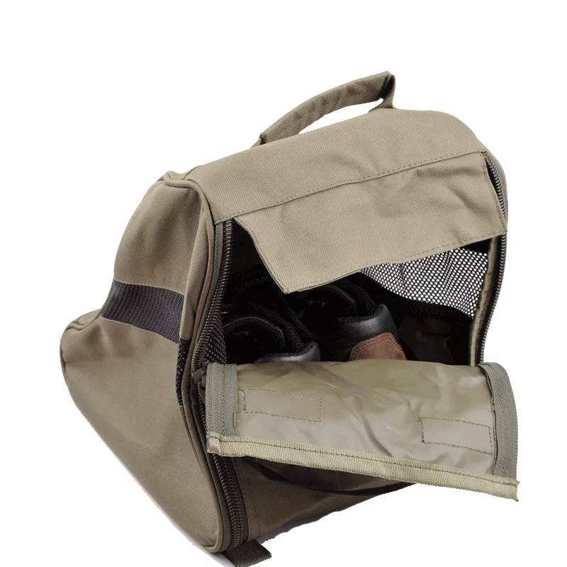 Die DJV-Schuhtasche ist geeignet für alle Schuhe bis Schuhgröße 48 und einer Schafthöhe von 24 cm. Die Tasche ist mit einem praktischen Tragebügel an der Oberseite ausgestattet sowie Lüftungsnetzen an den Seiten, die für ausreichende Belüftung der Schuhe auch bei geschlossener Tasche sorgen. Mit den beiden verbundenen Reißverschlüssen kann die Klappe schnell geöffnet werden und ermöglicht ein einfaches Einpacken der Schuhe. Bei Nichtgebrauch kann sie klein zusammengefaltet werden. Das DJV-Logo ist als Leder-Applikation auf der Oberseite der Tasche angebracht.