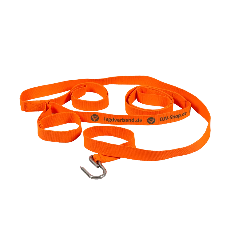 Die praktische Wildbergehilfe verfügt über insgesamt drei Zugschlaufen, wovon eine auch als Schultergurt eingesetzt werden kann. Der 3 cm breite und 300 cm lange Gurt aus reißfestem Polyester ist mit einem stabilen Edelstahlhaken versehen.