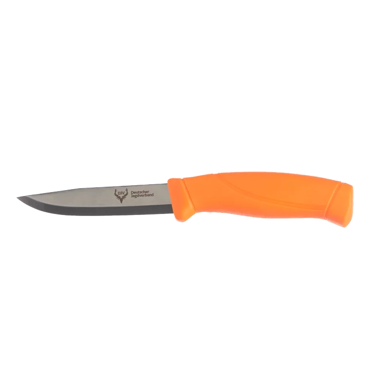 Die Klinge aus kaltgewalztem rostfreiem Spezialstahl von Sandvik (Schweden) ist extrem scharf, der ergonomisch gestaltete Griff liegt gut in der Hand. Die leichte, orangene Köcherscheide aus robustem Kunststoffmaterial kann mit einem Clip schnell am Gürtel befestigt werden. Das Highlight dieser unverwechselbaren Sonderedition ist das eingearbeitete DJV-Logo auf der Klinge.