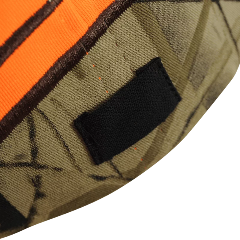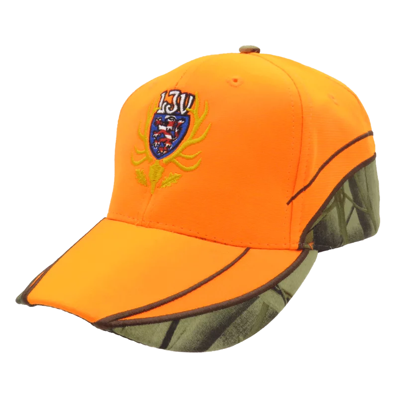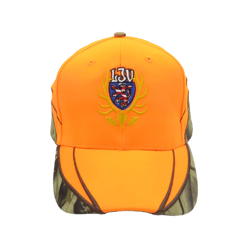 Der signalorange Teil der Kappe sorgt für Sicherheit bei der Jagd, farblich abgesetzt ist der untere Teil der Kappe in Camouflage gehalten. Auf der Frontseite ist die Kappe mit dem LJV-Hessen-Logo in verschiedenen Farben bestickt.