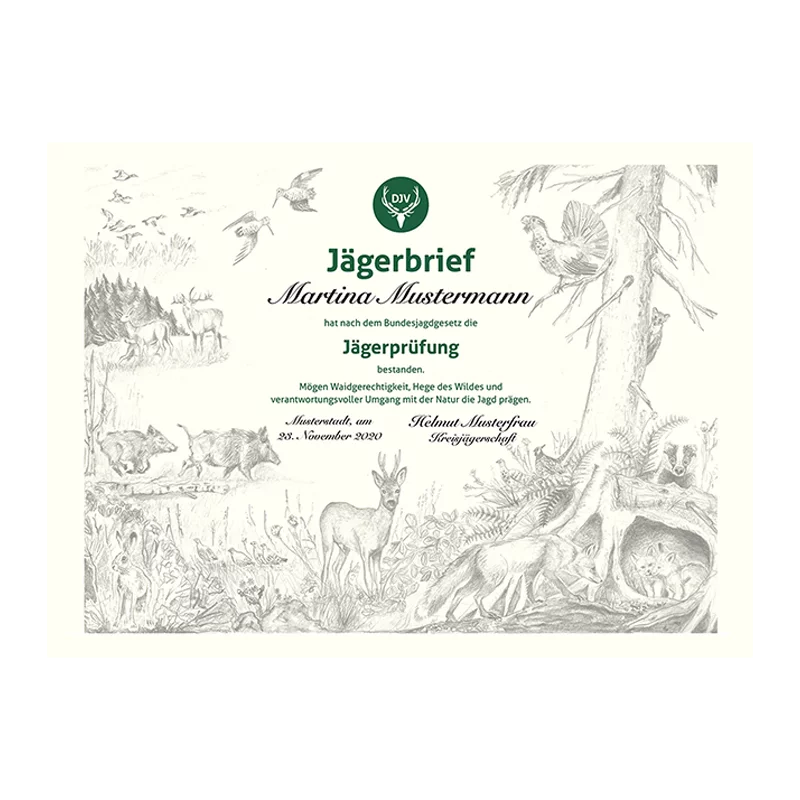 Das Format DIN A3 bietet die Möglichkeit, den Namen des erfolgreichen Jungjäger-Prüflings, Datum und Kreisjägerschaft entweder mit einem Laser- oder Tintenstrahldrucker aufzudrucken oder den Brief von Hand zu beschreiben. Der Rand lässt die Möglichkeit, die Urkunde an Bilderrahmen anzupassen.