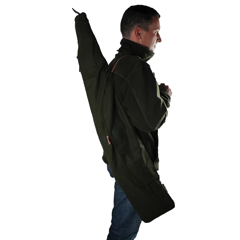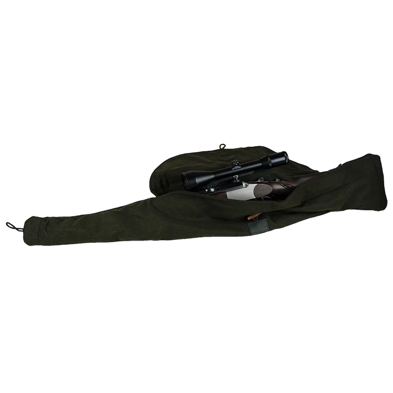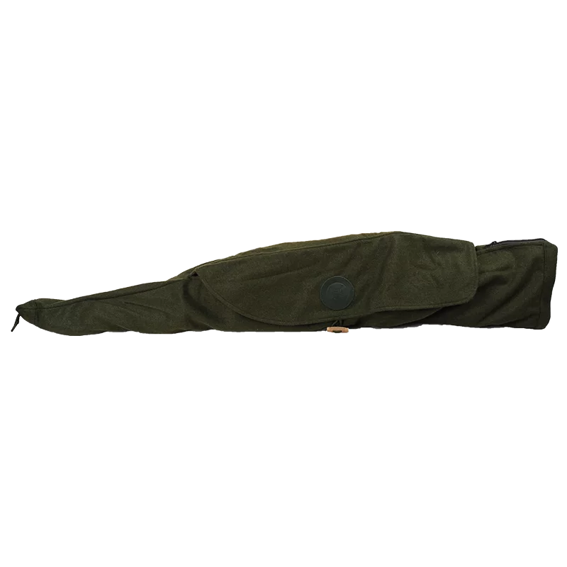 Das Futteral aus grünem oder braunem lodenähnlichen Flüsterstoff nimmt Büchsen (auch mit montiertem Zielfernrohr) und Flinten bis zu 123 cm Länge auf. Der Gewehrriemen der Waffe kann weiter genutzt werden, mit dem Holz-Knebelverschluss und der seitlichen Klappe mit DJV-Logo kann es schnell und flüsterleise geöffnet werden.