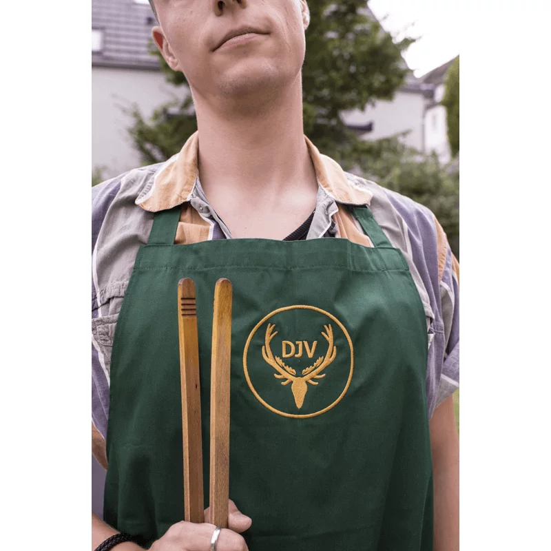Wenn es ums Kochen und Grillen geht, ist eine Schürze unerlässlich. Die DJV-Grillschürze ist ein stylischer Fleckenschutz im schlichten Design und ist mit einem verstellbaren Halsband auf alle Körpergrößen einstellbar. Das gestickte DJV-Logo in Gold oder Silber wirkt sehr wertig auf der waldgrünen Schürze. Pflegeleichtes Baumwollmischgewebe, problemlos waschbar.