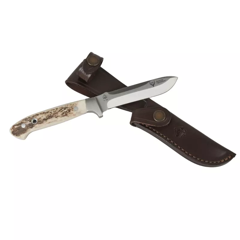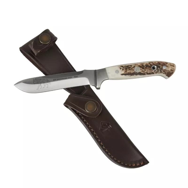 Das DJV-Jahresmesser 2026 „Wolf“ von PUMA ist ein kompaktes Jagd- und Outdoormesser aus 1.4125 Stahl mit Griffschalen aus Hirschhorn und einer braunen Sattellederscheide.