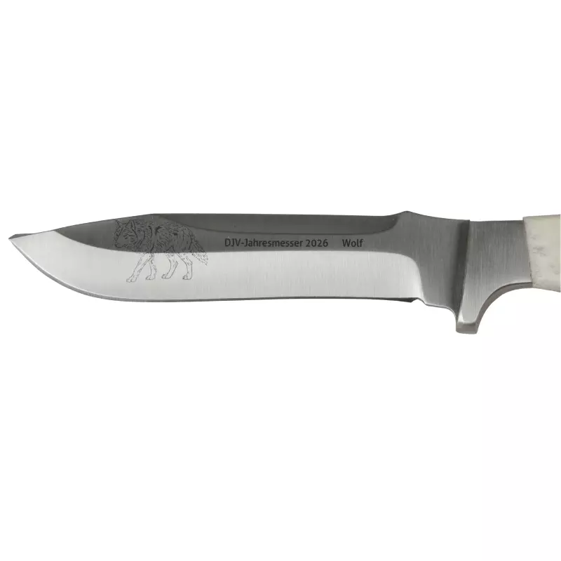 Eine Klingenseite wird verziert durch die Laserung eines Wolfs sowie den Schriftzug „DJV-Jahresmesser 2026 Wolf“. Die anderen Klingenseite trägt das DJV-Logo und den Schriftzug „Deutscher Jagdverband“. Die Auflage ist auf 365 Stück limitiert, die