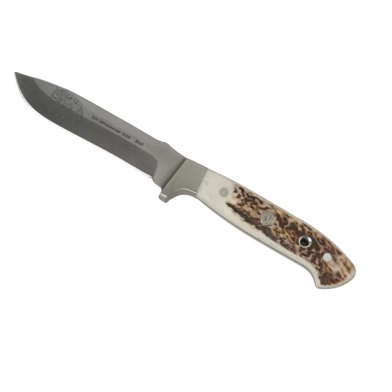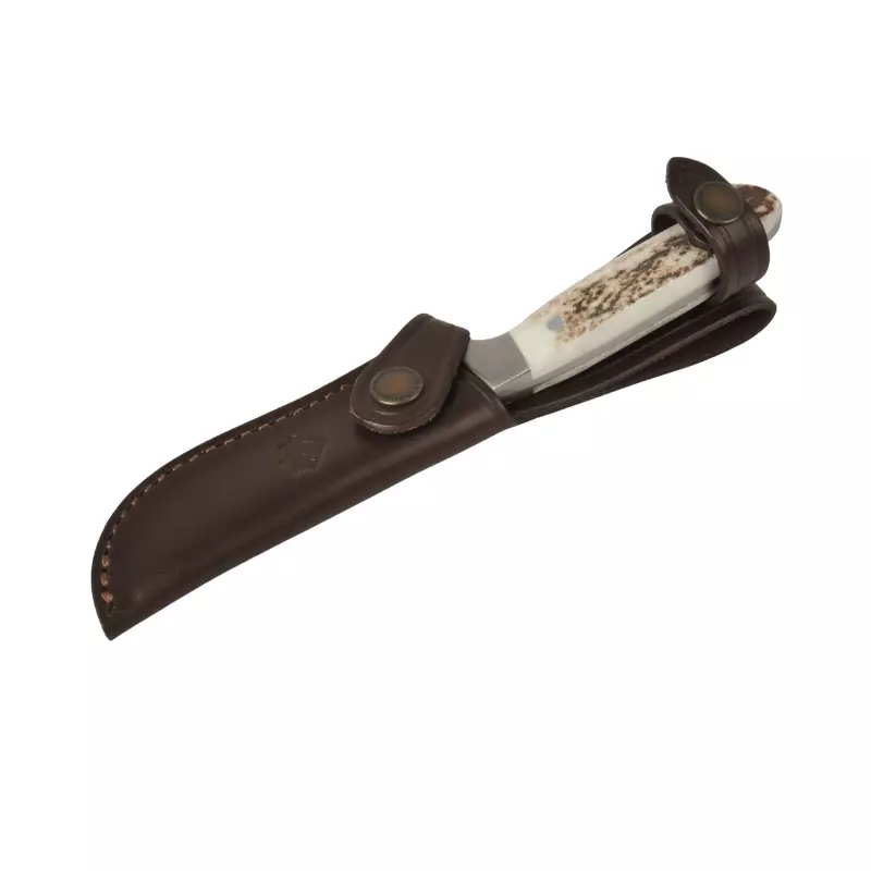 Die stabilen Griffschalen aus echtem Hirschhorn verleihen der Hand bei der Schneidarbeit einen sicheren Halt, im hinteren Bereich des Griffs ist eine Fangriemenöse eingebaut. Die ansprechende Optik sowie die Backen aus Neusilber runden die saubere Verarbeitung ab.