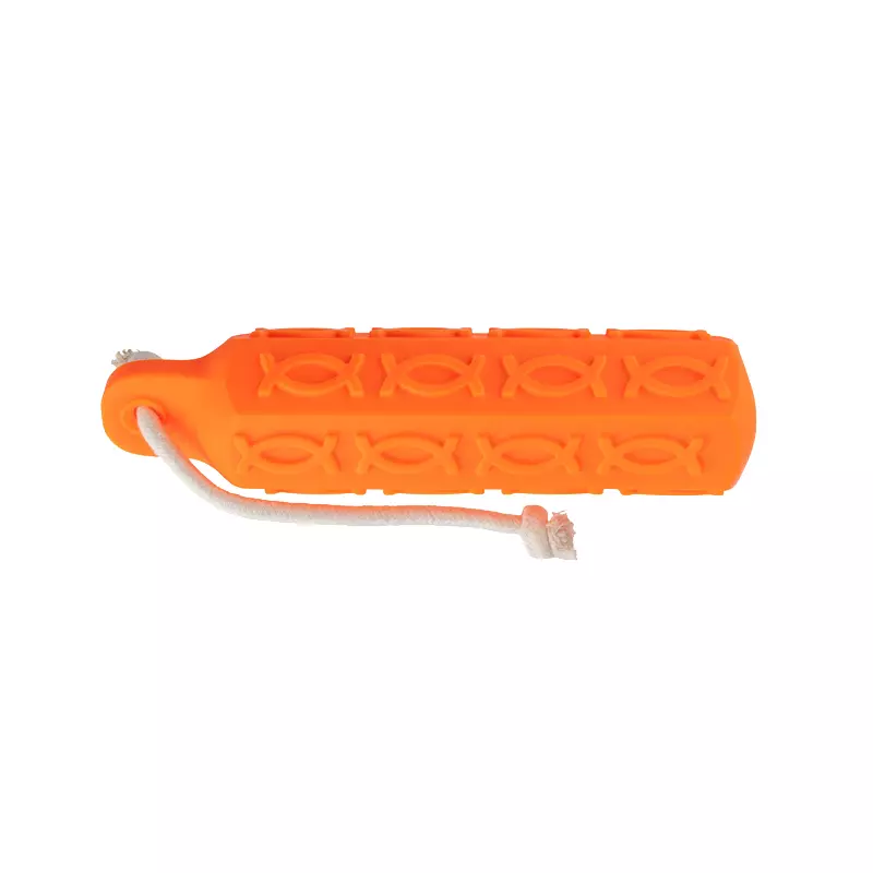 Durch die 6-eckige Form kann der Hund diesen immer gut greifen und halten. Weiterhin sorgt ein Reliefmuster für eine bessere Halteeigenschaft. Eine 8 mm starke Baumwollkordel ermöglicht es dem/der Hundeführer/in, den Dummy aus kurzer oder weiter Entfernung gezielt zu auszubringen.