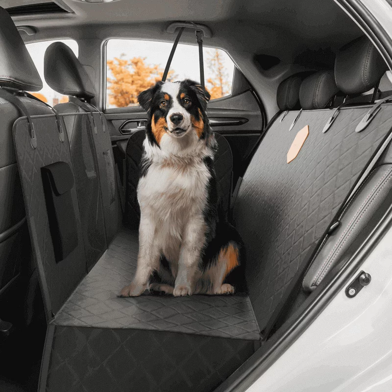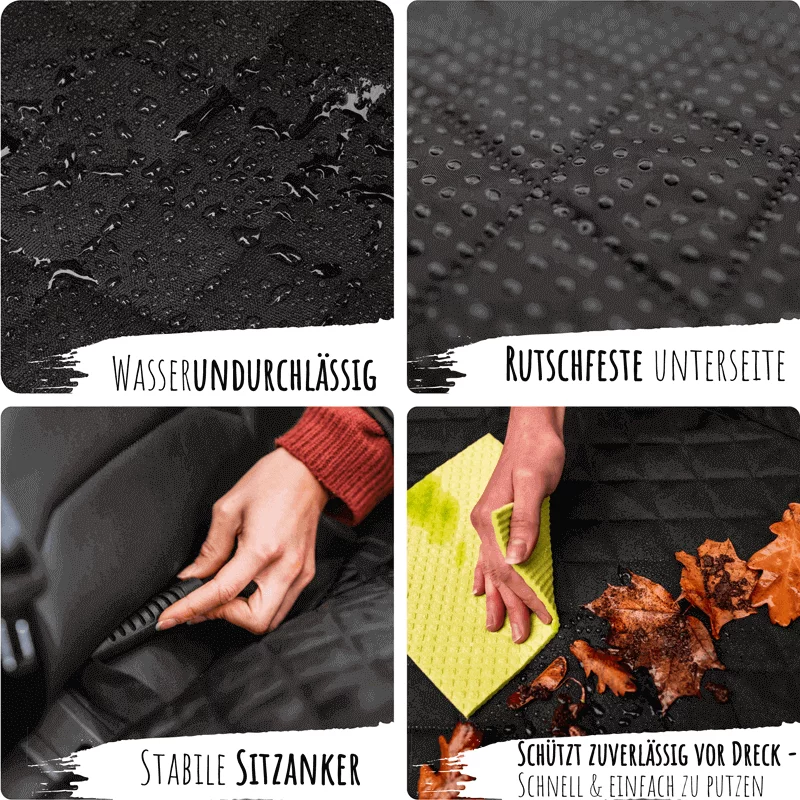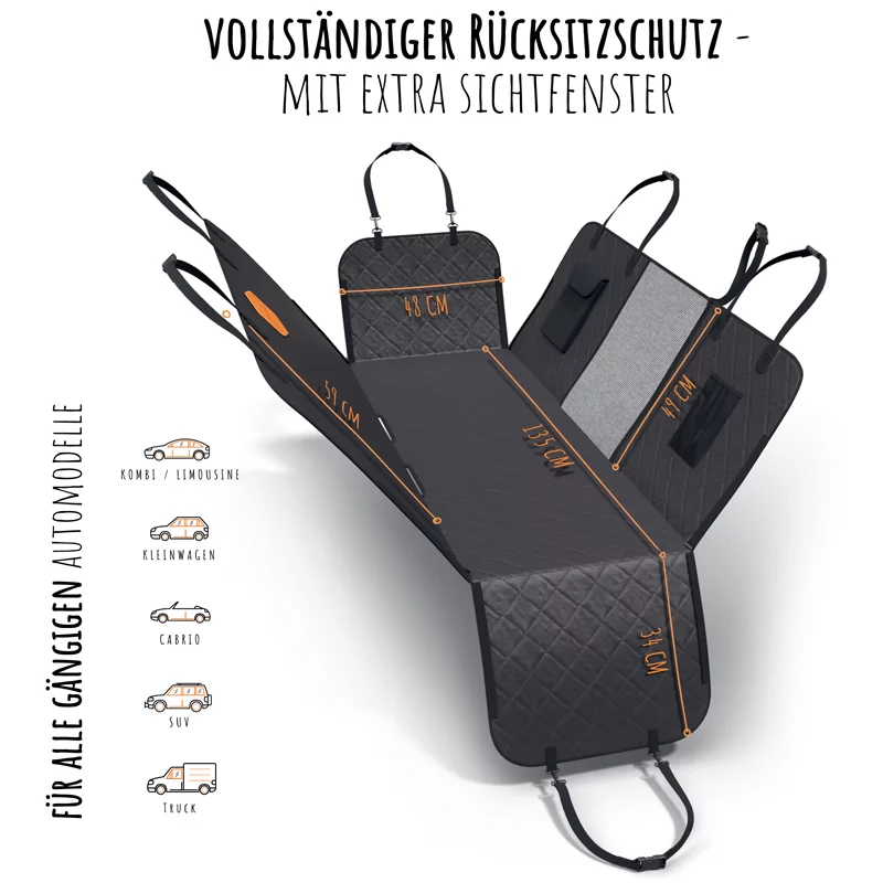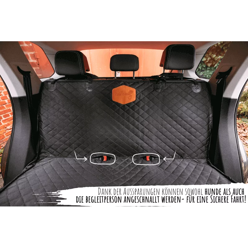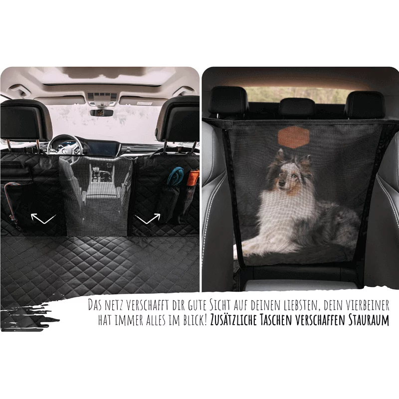 Wasserabweisende und pflegeleichte Hundedecke für die Auto-Rückbank mit Seitenschutz und Sichtfenster.