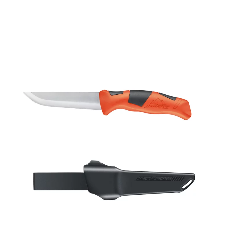 Das Alpina Sport Ancho verfügt über eine 109 mm lange Klinge aus gut nachschärfbarem 420er Stahl und einen rutschfesten Kunststoffgriff mit TPR-Einlagen. Die farblich passende Kunststoffscheide hält das Messer sicher fest und kann mit dem integrierten Clip am Gürtel getragen werden.