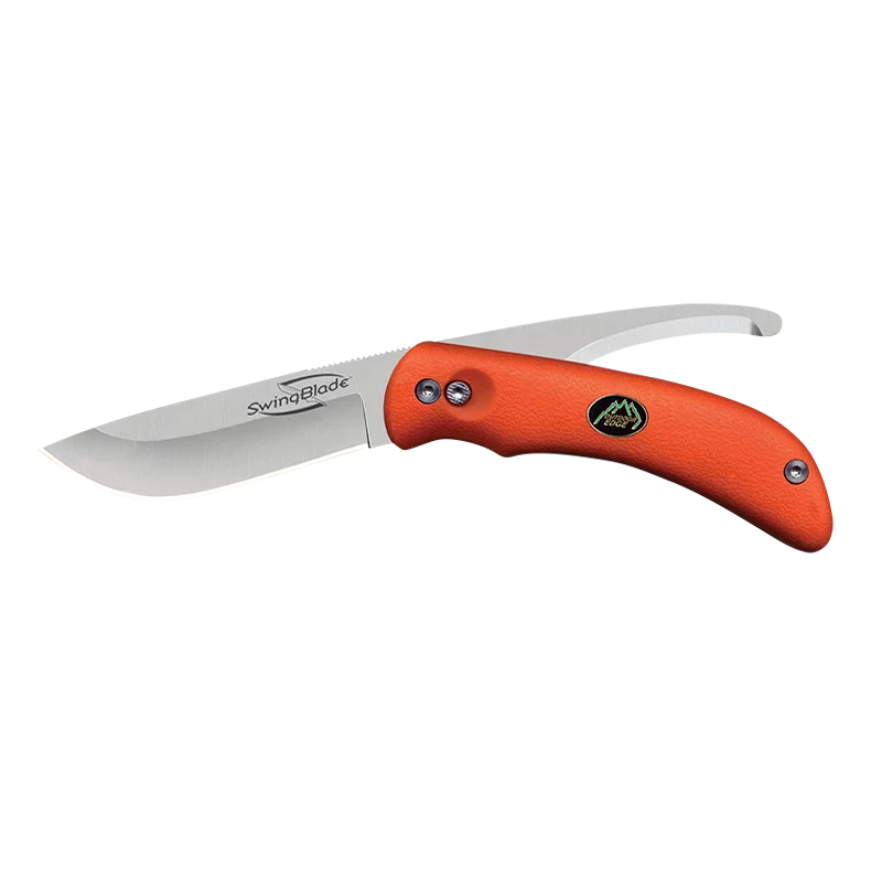 Das praktische SwingBlade von Outdoor Edge kombiniert die Vorteile eines feststehenden Jagdmessers mit der Vielseitigkeit eines Messers mit Wechselklinge. Durch Lösen der Verriegelung kann die einteilige Klinge um 180° geschwenkt werden und bietet somit entweder eine vielseitige Droppoint-Skinnerklinge oder aber eine spezielle Aufbruchklinge, mit der die Decke des Stückes sicher und einfach geöffnet werden kann, ohne dass Haar durchtrennt oder Innereien verletzt werden. Der Griff aus plastischem Elastomer bietet eine ausgezeichnete Handhabung, verbunden mit einer hohen Rutschsicherheit und ist auch bei Kälte angenehm zu greifen.