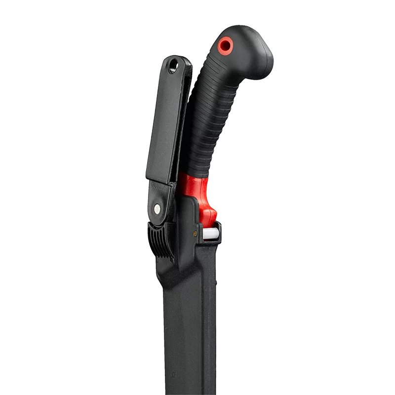 Sägenköcher mit Zahnrolle und Gürtelschlaufe. Die Klemmvorrichtung im Köcher fixiert die Säge in allen Lagen und Höhen.