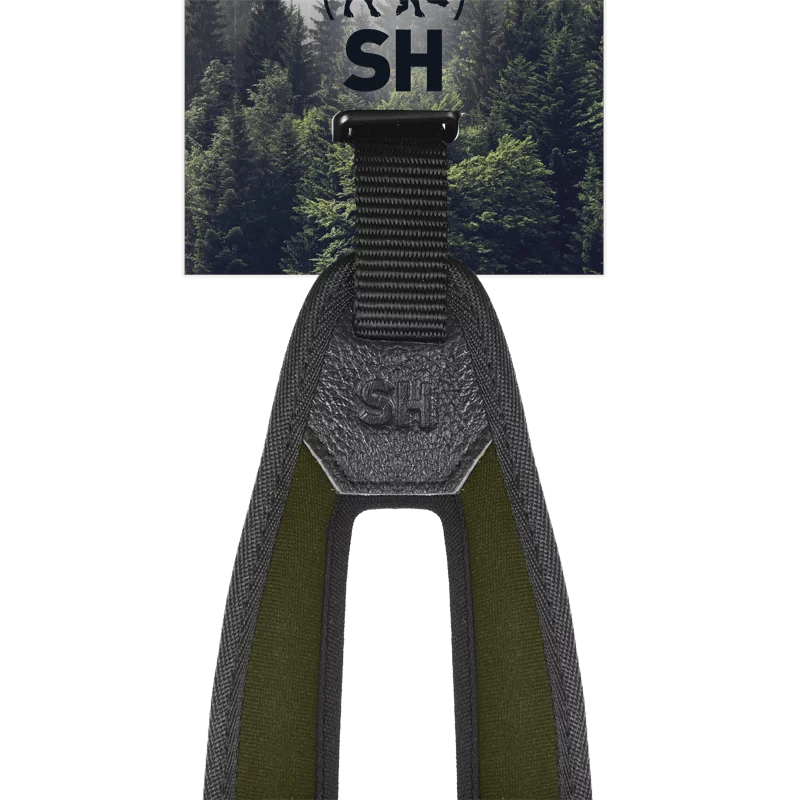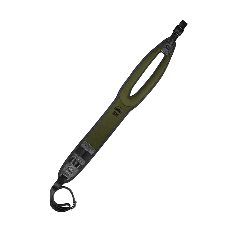 Der Sauenhammer-Gewehrriemen ist mit der einzigartigen 'Non-Elastic Neopren-Technologie' versehen. Das Neopren ist im Bereich der Hand-Schlaufe nicht elastisch, dies garantiert maximale Stabilität im Anschlag. Oben und unten ist der Gewehrriemen mit hochwertigen schwarzen Lederbesätzen und dem Sauenhammer-Logo versehen. Die Ränder der Öffnung sind sauber und hochwertig abgenäht und sorgen dadurch für hohen Komfort in der Schussposition.