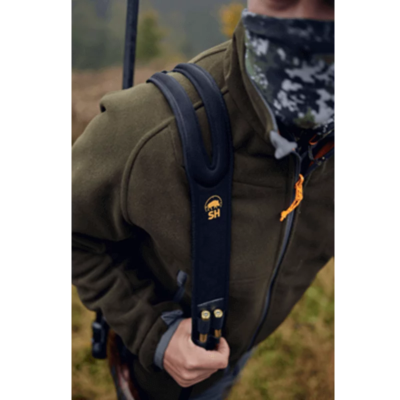 Die breite Auflage des Sauenhammer-Gewehrriemens sorgt für sehr hohen Tragekomfort. Die Führungsriemen der Öffnung passen sich individuell Ihrem Körper an, die der Kleidung aufliegende Seite besteht aus extrem rutschfestem perforiertem Gummi. In den Sommermonaten und bei der Jagd auf 'Weizenschweine' sorgt die Öffnung für eine bessere Belüftung der Schulterpartie.