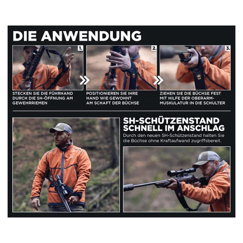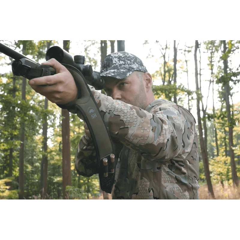 Der Sauenhammer-Gewehrriemen definiert das Design und die Funktionalität von Gewehrriemen neu. Mit dem patentierten Sauenhammer-Gewehrriemen ziehen Sie Ihre Büchse oder Flinte fest in die Schulter und sorgen für ein deutlich ruhigeres Absehen und mehr Kontrolle bei der Schussabgabe. Eine 3 cm breite (bis auf 16 cm dehnbar) und 17 cm lange Öffnung im oberen Drittel des Gewehrriemens sorgt für ausreichend Platz, um die Führhand hindurchzustecken. Ziehen Sie nun mit Hilfe Ihrer Oberarmmuskulatur die Büchse fest in die Schulter. Dadurch wird deutlich mehr Stabilität im Anschlag und bei freihändigen Schüssen gewonnen. Das Prinzip ist seit Jahren durch den klassischen Sauenhammer bekannt. Das Mitschwingen auf ziehende Sauen wird spürbar ruhiger. Dadurch, dass die Büchse nun wesentlich besser in die Schulter gezogen werden kann, reduziert sich auch der Hochschlag bei Schussabgabe.