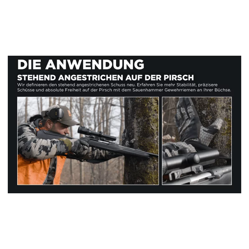 Der stehend angestrichene Schuss wird durch den Sauenhammer-Gewehrriemen wesentlich erleichtert. Führt man die Führhand durch die Öffnung, kann man sich einfach an einen Baumstamm oder den Stützpfeiler des Hochsitzes lehnen. Die Büchse wird hierbei nicht auf dem Daumen oder dem Knöchel aufgelegt, sondern hängt sicher an der Riemenbügelöse. Die Hand in der Schlaufe am Sauenhammer-Gewehrriemen fixiert die Büchse sicher an Baum oder Holm.