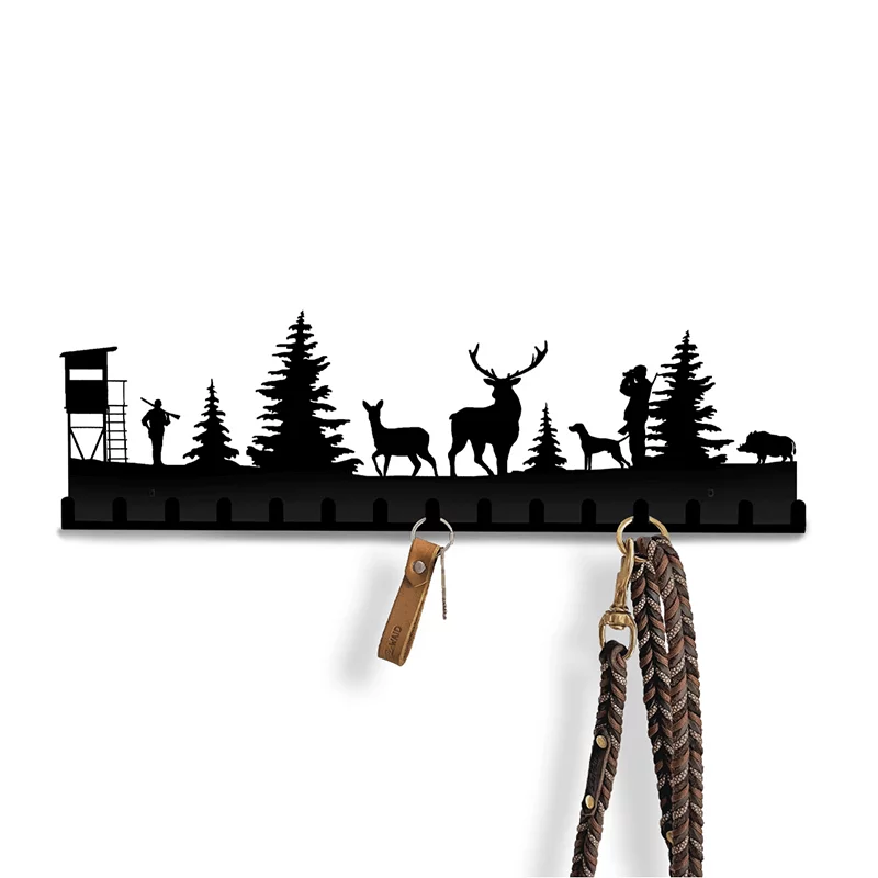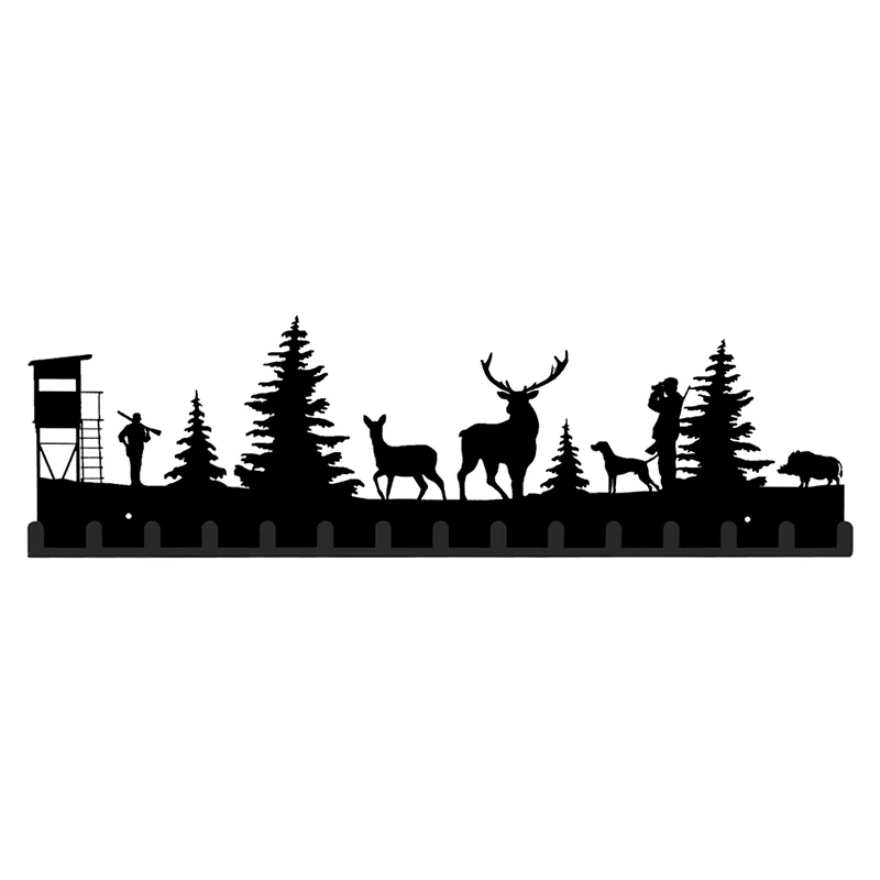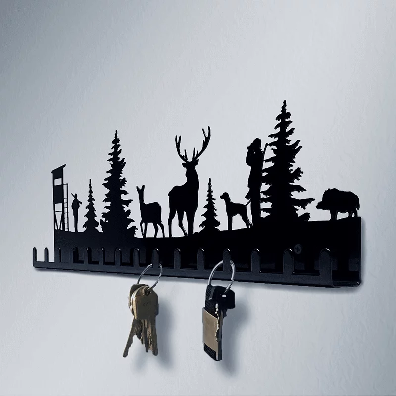 Die Gaderobe zeigt eine schöne jagdliche Landschaft als Skyline ausgelasert. Hier gibt es viel zu entdecken: Mit Bäumen, Hochsitz, Rothirsch und Kahlwild, Wildschwein und Jäger mit Jagdhund ist die Gaderobe ein toller Blickfang.
