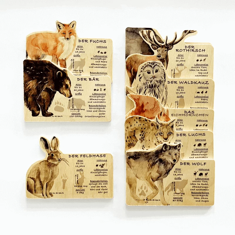 Auf den Karten ist eine wunderschöne Zeichnung des Tieres und seiner Spur, mit Informationen zu Nahrung, Lebensweise, Gewicht und Größe und einigen Besonderheiten. Die Karten sind aus aus FSC Zertifizierten Buchensperrholz und lassen sich wunderbar mit in den Wald auf Spurensuche nehmen.