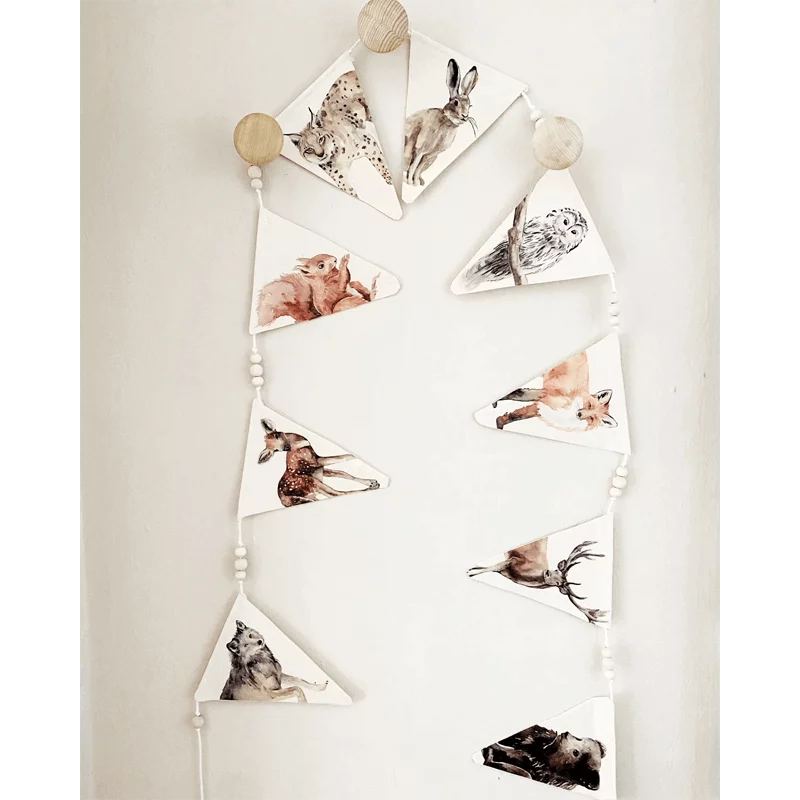 Eine hübsche Wimpelkette mit 9 Waldtieren in Aquarell gemalt und gedruckt auf 100% Oekotex Baumwolle.
