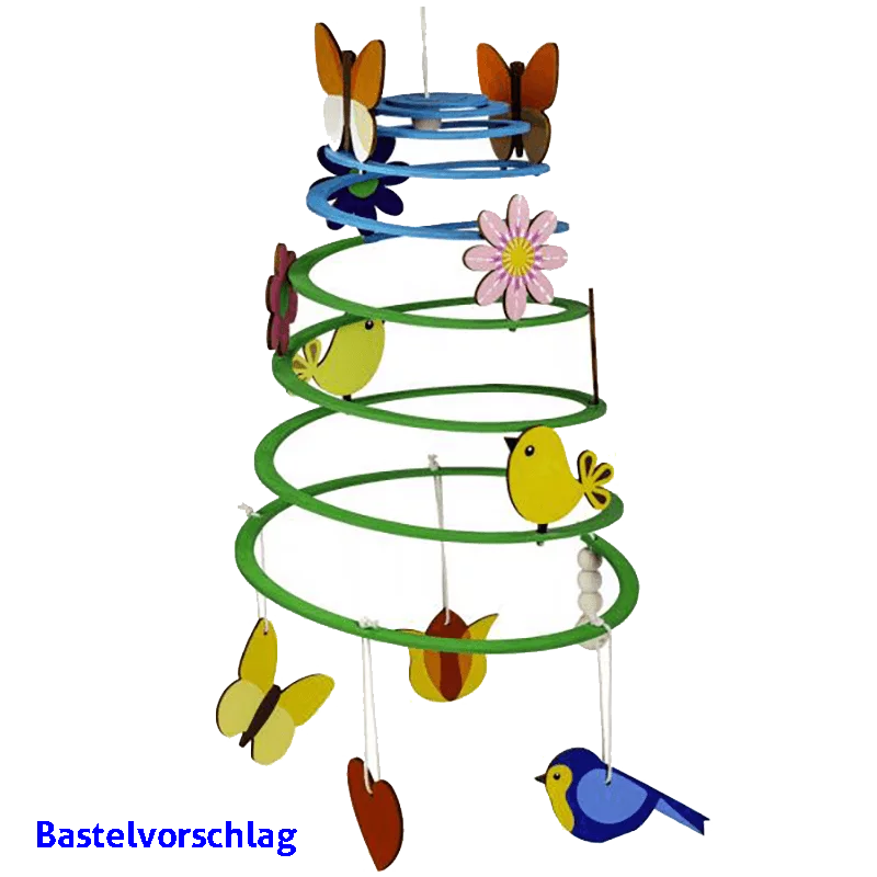 Hier ist alles im Thema Frühling und Sommer! Große Schmetterlinge und Vögelchen und auch verschiedene Blumen und Herzen schmücken das schöne Mobile. Ideal zum Bemalen und Gestalten, aber auch naturbelassen verwandelt sich dieses Set in ein wunderschönes Mobile, das beim Aufhängen eine elegante Pyramidenform annimmt.