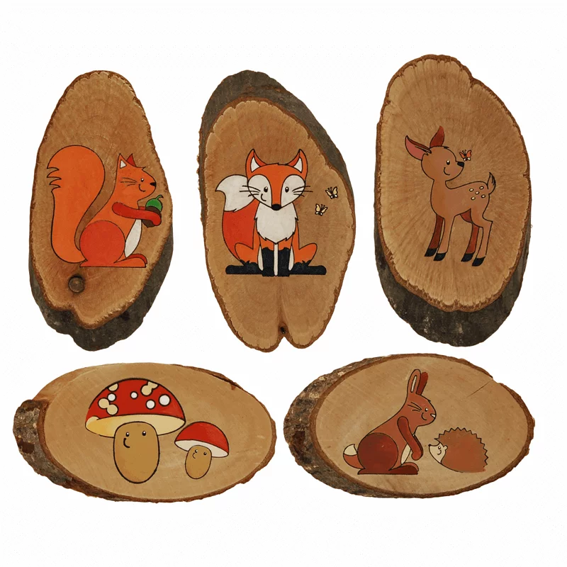 Die Baumscheiben können bemalt oder mit Brenneisen in Brandmaltechnik gestaltet werden. In der Bauecke werden die Scheiben zum naturnahen Bauen und Konstruieren benutzt.