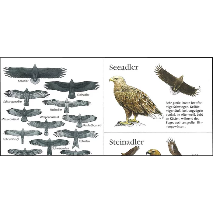 Die zusammenfaltbare Bestimmungstabelle bietet mit Abbildungen und Kurzbeschreibungen eine kurze Übersicht der heimischen Greifvögel, die auf Wanderungen schnell zur Hand ist.