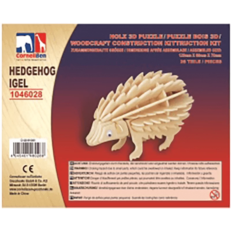 Der Holz 3D Igel besteht aus 26 Teilen und steht auf seinen vier Füßen sehr stabil. Das 3D Puzzle zeigt deutlich seine vielen Stacheln. Das Holz ist unbehandelt und eignet sich hervorragend für weitere Bastelaktionen wie bemalen oder bekleben. Das 3D Puzzle bietet Freude für die gesamte Familie und Spaß für alle Wildtier-Fans!