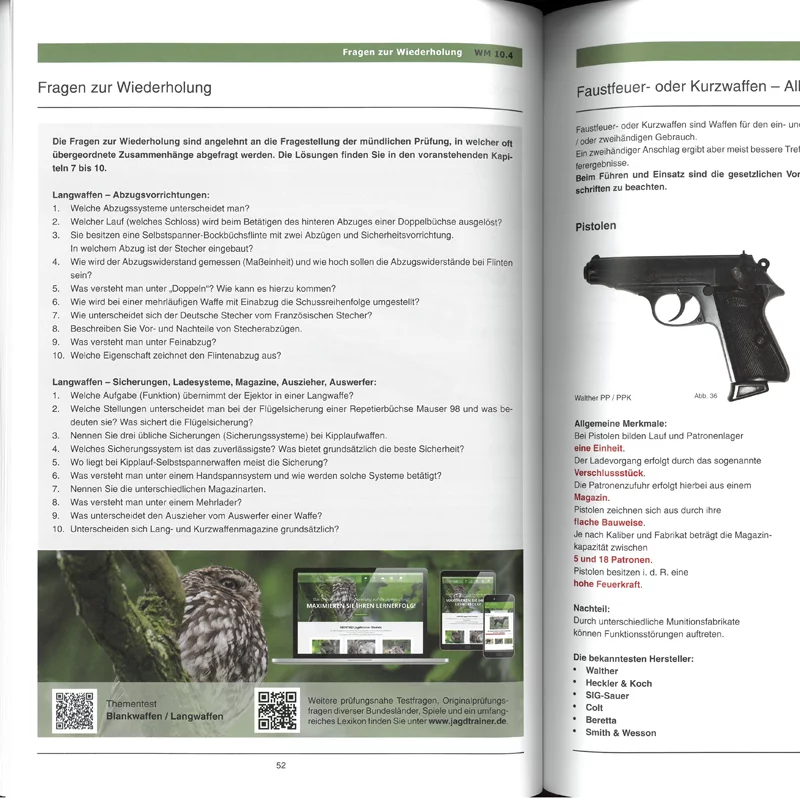 Das Lernheft Waffen und Munition bietet den Jagdscheinanwärtern umfangreiche und dem Ausbildungsstoff angepasste Inhalte. Zudem werden die Lernhefte auch nach der Prüfung gerne als Nachschlagewerk genutzt. Über QR-Code können prüfungsrelevante Thementests aufgerufen werden.