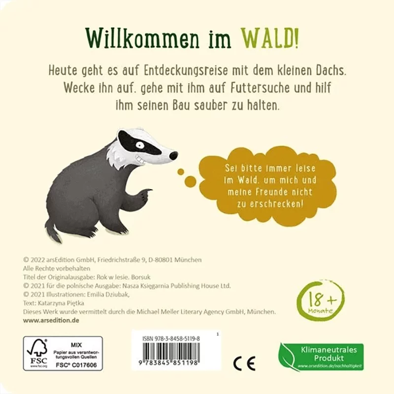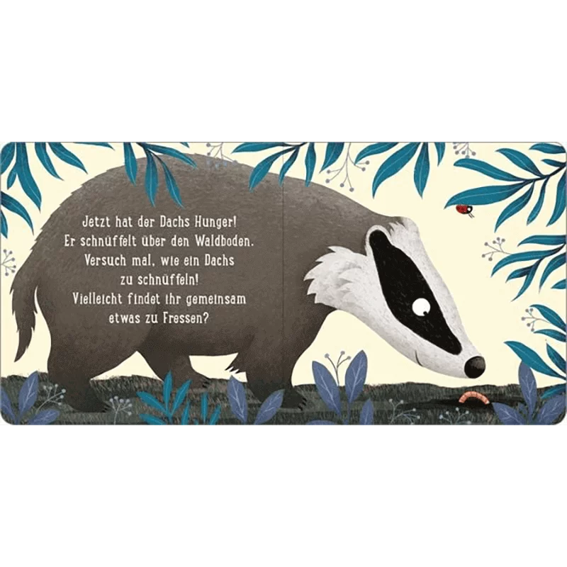 Ein erstes interaktives Pappbilderbuch über den Wald und seine Bewohner. Die zauberhaften Bilder von der international gefeierten Illustratorin Emilia Dziubak laden auf einen Streifzug mit dem kleinen Dachs ein. Der kurze begleitende Text vermittelt spielerisch erste Sachinformationen und fordert die kleinen Betrachter immer wieder dazu auf, aktiv in das Buchgeschehen einzugreifen. Erster interaktiver Buchspaß für Kinder ab 18 Monaten, der das Waldleben schon für die Kleinsten greifbar macht. Die dicken Pappseiten sind perfekt geeignet für kleine Kinderhände.