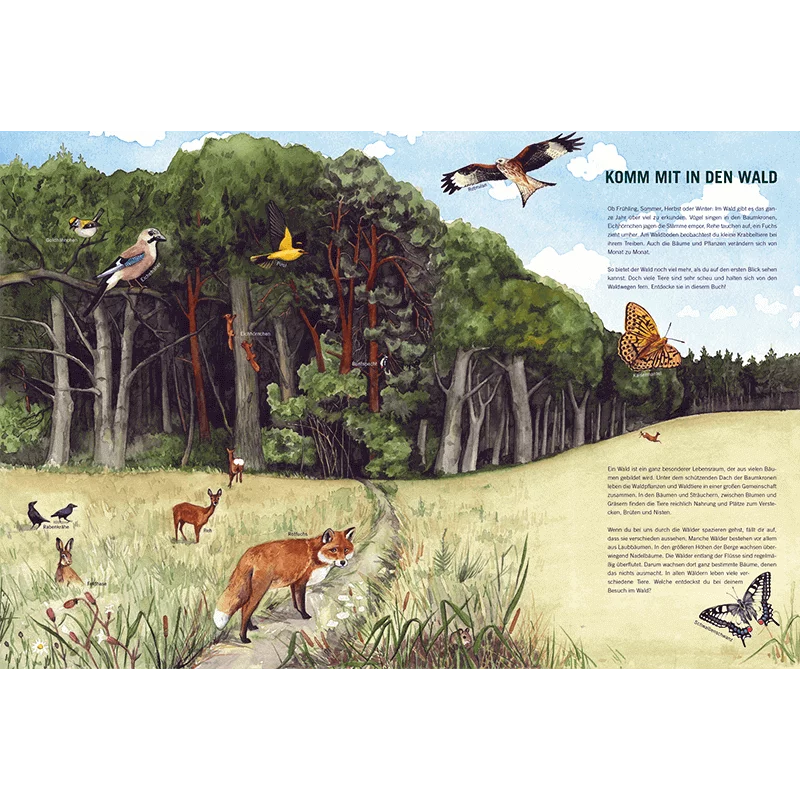 Auf farbenfrohen und detailverliebten Wimmelbildern lässt sich der Wald aufmerksam erkunden. Der Wald gehört für Kinder zu den spannendsten Lebensräumen, die es vor der eigenen Haustür zu entdecken gilt.