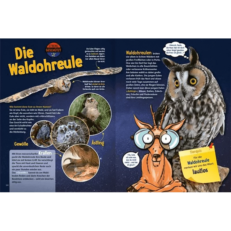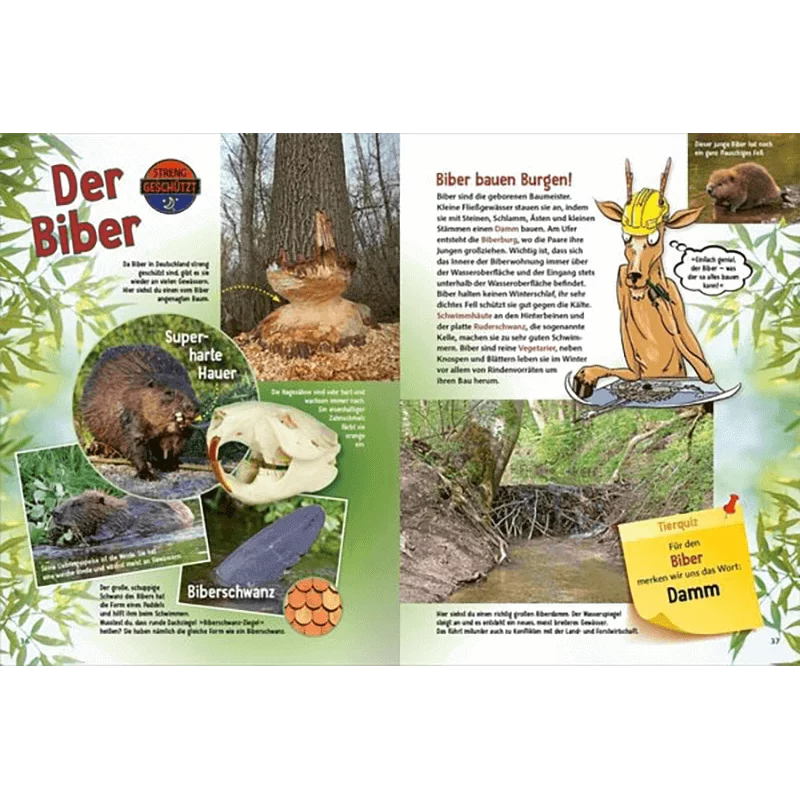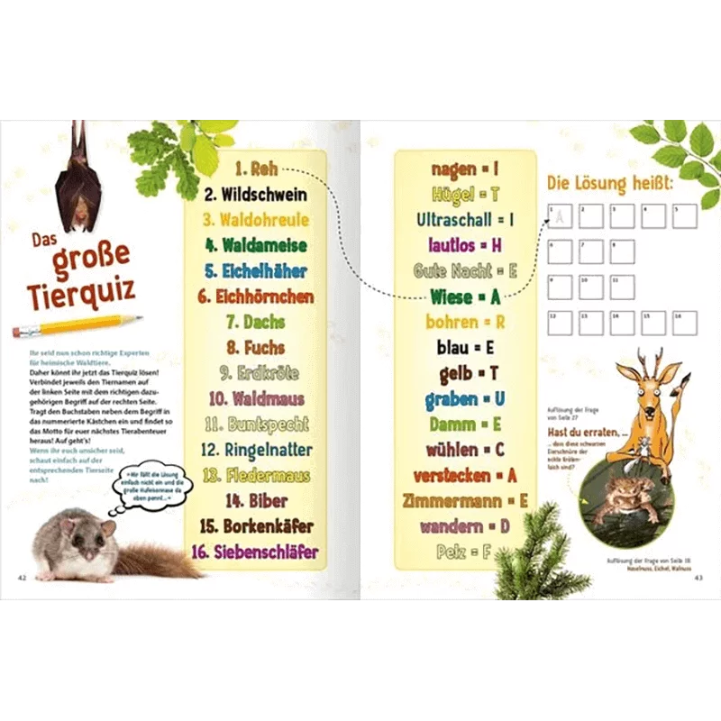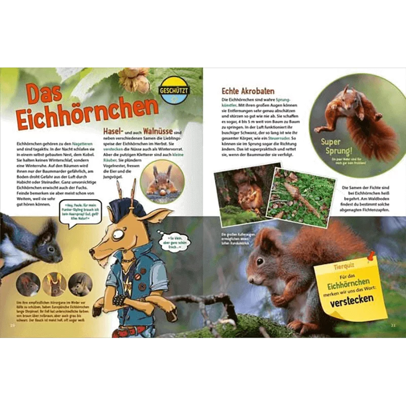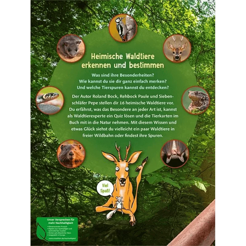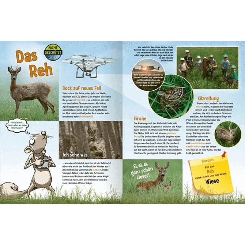 Am Ende des Naturführers für Kinder ist ein umfangreiches Quiz, welches das erlernte Wissen noch einmal festigt und viel Spaß bereitet. Durch das Buch führen Rehbock Paule und Siebenschläfer Pepe und sprechen die Kinder aktiv an. So ist Lernen kinderleicht und macht viel Freude!