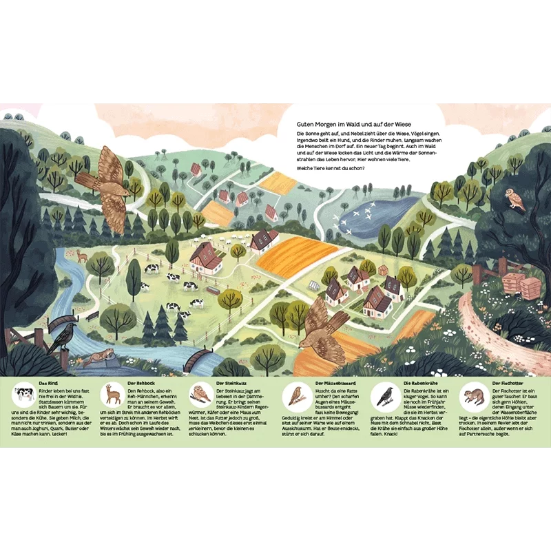 Ein Fischotter mit Fisch im Fang, ein Schwarm Bienen, die um die Bienenkästen schwirren, ein Kuckuck, der seine Eier im Nest von anderen Vögeln versteckt - es gibt überall etwas zu entdecken! Auf jeder Doppelseite sind kleine Erklärtexte zu vielen Tieren, um noch mehr über unsere Fauna und Flora zu lernen und zu verstehen. Ein tolles Buch!