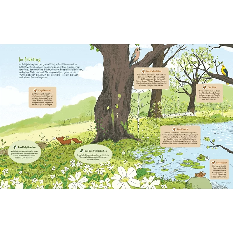Auf großen Doppelseiten springt Matti von Ast zu Ast und zeigt uns seine Welt. Auf jeder neuen Seite verstecken sich andere Tiere, zu denen Marder Matti eine Menge zu erzählen hat.