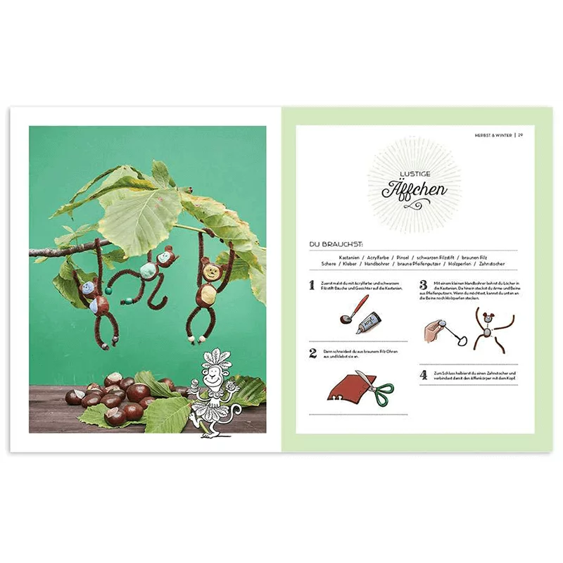 Die Bastelideen sind nach den Jahreszeiten Frühling bis Sommer und Herbst bis Winter sortiert. So findet man im Herbst auch eine tolle Doppelseite über Kastanienmännchen. Es sind jedoch besondere Kastanienmännchen - es sind Kastanienäffchen, die lustig durch die Gegend schwingen und die in bunten Farben den Djungel unsicher machen.