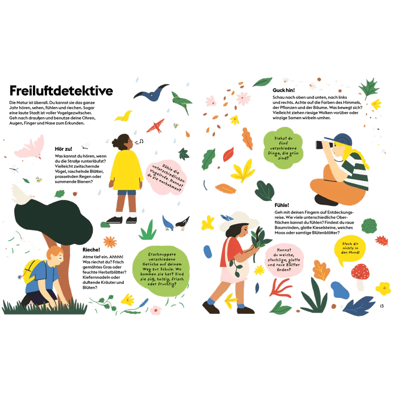 Die Welt draußen wartet nur darauf, entdeckt zu werden. Raus an die frische Luft! zeigt, dass man die Natur nicht nur sehen, sondern auch hören, fühlen und riechen kann.