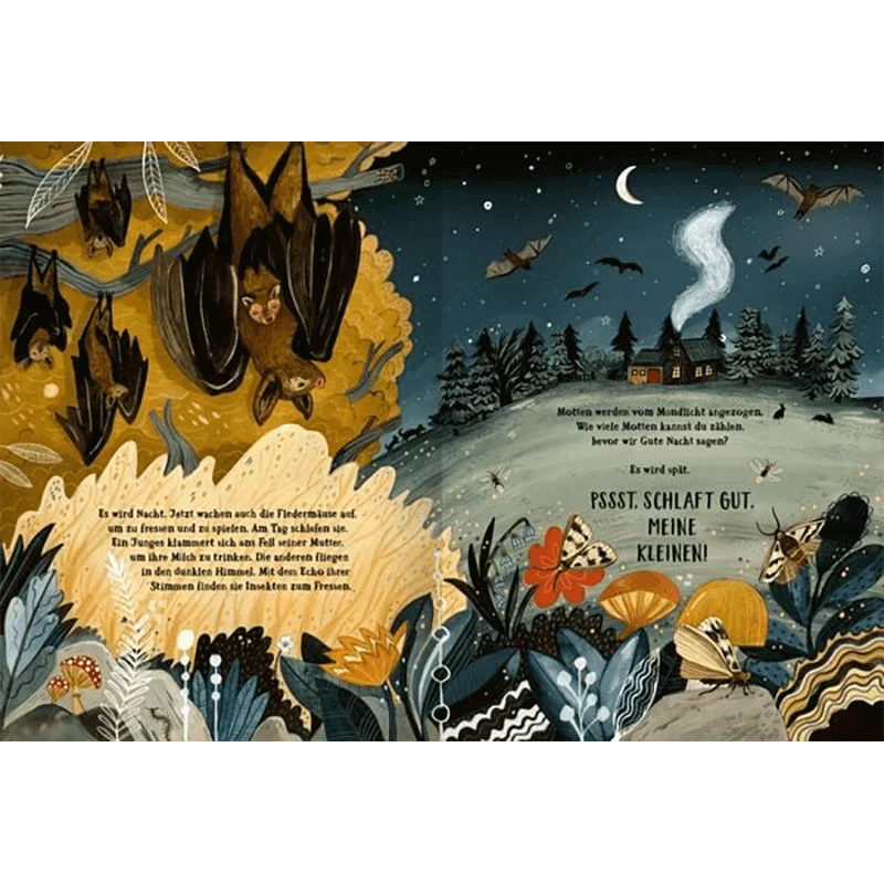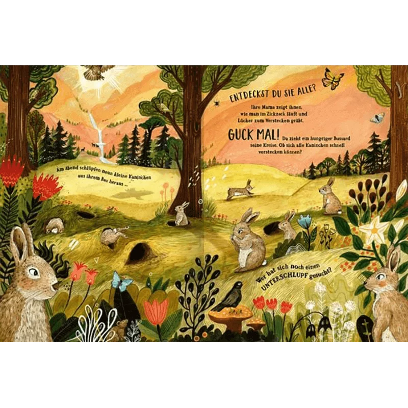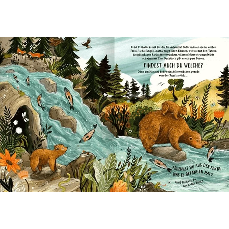 Die Sonne geht auf und mit ihr werden die Waldbewohner wach. Auf den Doppelseiten gibt es außer den vielen verschiedenen Tieren auch Pflanzen, Berge und Bäume zu entdecken.