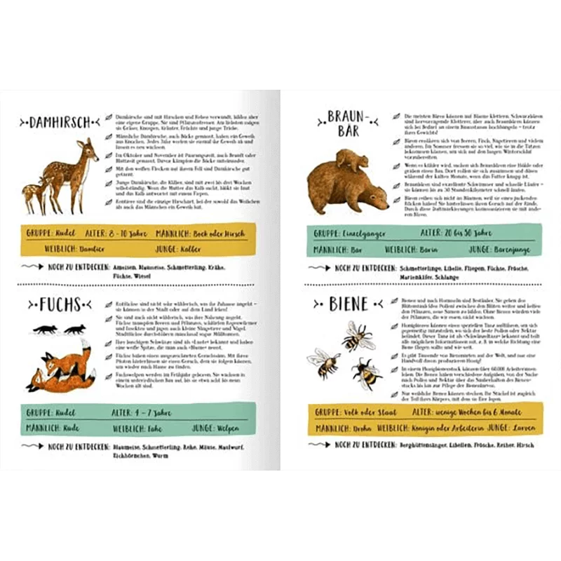 Im Laufe des Buches wandert die Sonne an ihren höchsten Punkt und geht irgendwann unter. Die Bienen und Schmetterlinge schwirren, der Hirsch schaut aus dem Wald heraus auf die Lichtung, der Specht hämmert an der Eiche. Spät am Abend schlafen die Waldbewohner, nur die Eulen und die Fledermäuse erwachen und neue Abenteuer gehen los! Das Kinderbuch ist ein Spaß für die gesamte Familie. Ein tolles Geschenk für alle, die lernen wollen wie viele alltägliche Wunder es im Wald zu erleben gibt. Am Ende des Buches gibt es über alle genannten Tiere noch eine Menge Sachinfos in überschaubaren Steckbriefen.
