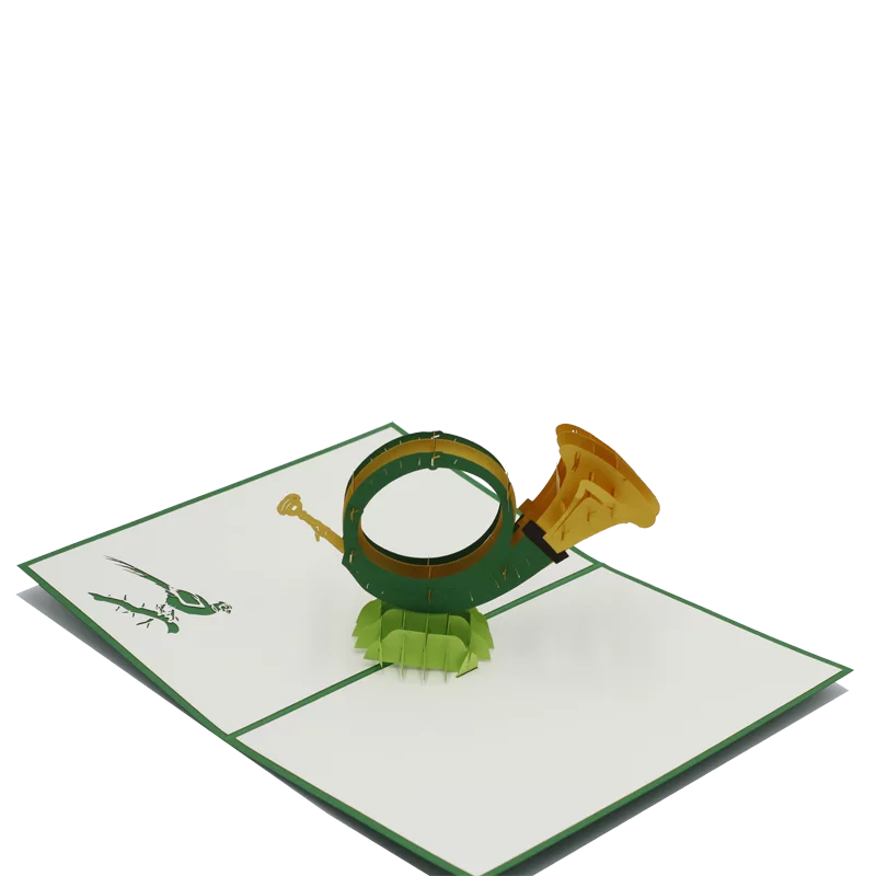 Wird die Karte aufgeklappt, stellt sich ein Hochsitz auf, auf dem ein Jäger ansitzt und ein Jagdhund daneben sitzt. Im Hintergrund stellt sich ein Wald mit Tieren auf. Ein Hirsch unten links ist in die Karte gestanzt.