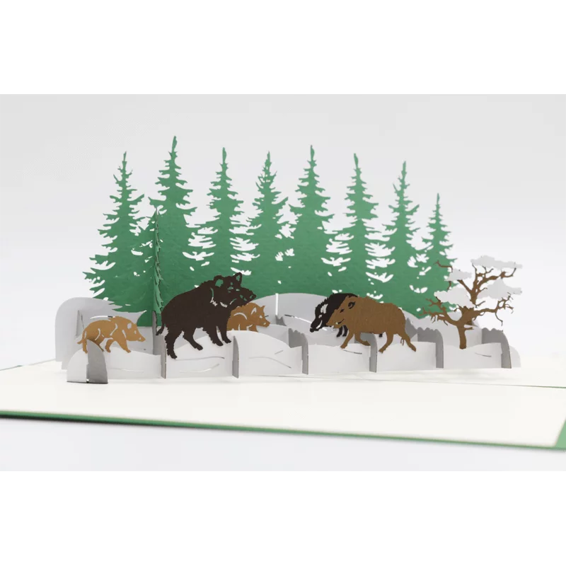 Pop-Up Karte "Wildschwein-Rotte Winterwald"