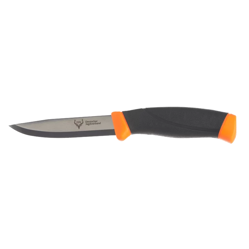 Die Klinge aus kaltgewalztem rostfreiem Spezialstahl von Sandvik (Schweden) ist extrem scharf, der ergonomisch gestaltete Griff liegt gut in der Hand. Die leichte, orangene Köcherscheide aus robustem Kunststoffmaterial kann mit einem Clip schnell am Gürtel befestigt werden. Das Highlight dieser unverwechselbaren Sonderedition ist das eingearbeitete DJV-Logo auf der Klinge.