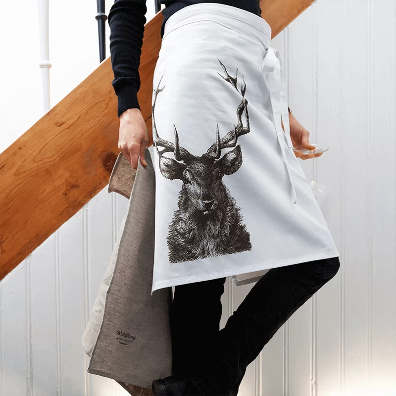 Das Hirsch-Motiv wird im handwerklichen Siebdruck dauerhaft auf die Schürze aufgebracht. Diese Technik sorgt für eine hohe Farbintensität.