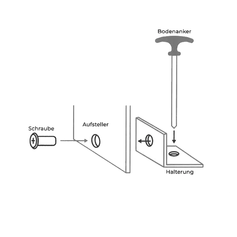 Ein Set besteht aus: Halterung, Bodenanker und Schraube mit Anleitung