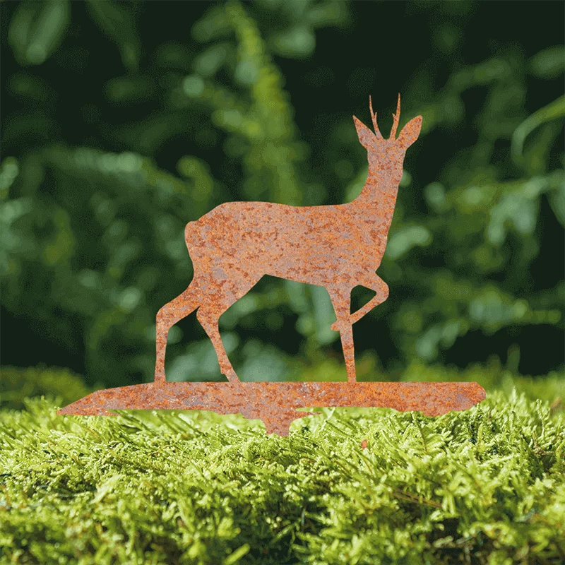 Der Blumenstecker mit der eleganten Silhouette eines Rehbocks von Werkplatz bringt rustikalen Charme in jeden Garten, jedes Beet oder auf den Balkon.