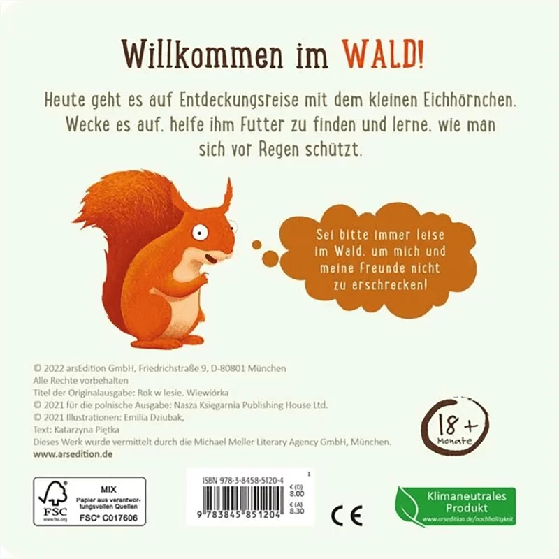 Ein erstes interaktives Pappbilderbuch über den Wald und seine Bewohner. Die zauberhaften Bilder von der international gefeierten Illustratorin Emilia Dziubak laden auf einen Streifzug mit dem kleinen Eichhörnchen ein. Der kurze begleitende Text vermittelt spielerisch erste Sachinformationen und fordert die kleinen Betrachter immer wieder dazu auf, aktiv in das Buchgeschehen einzugreifen.