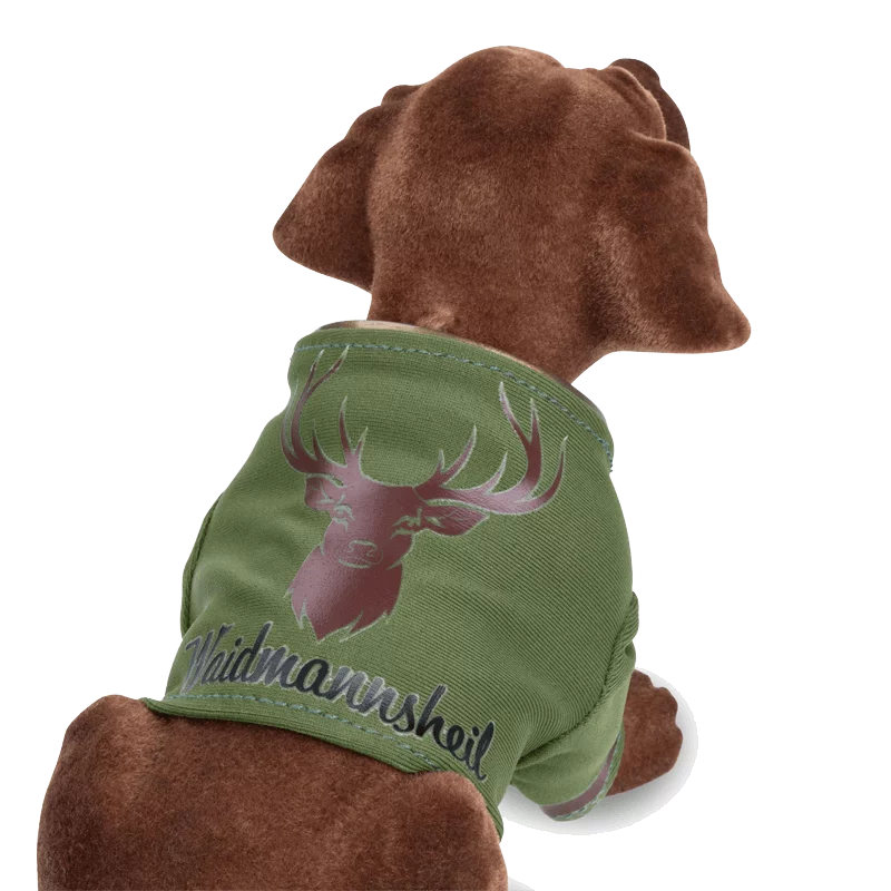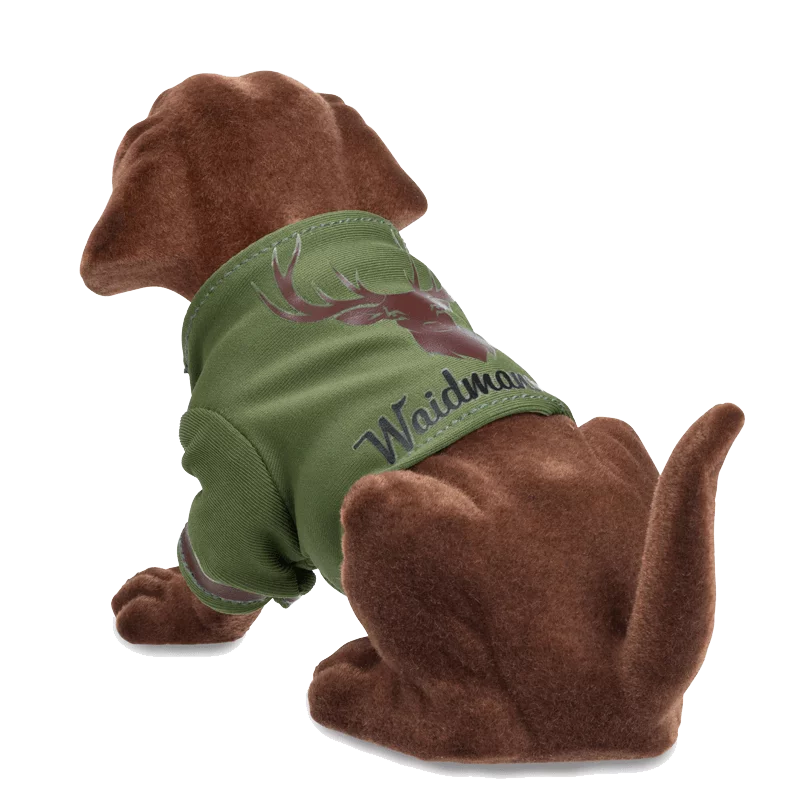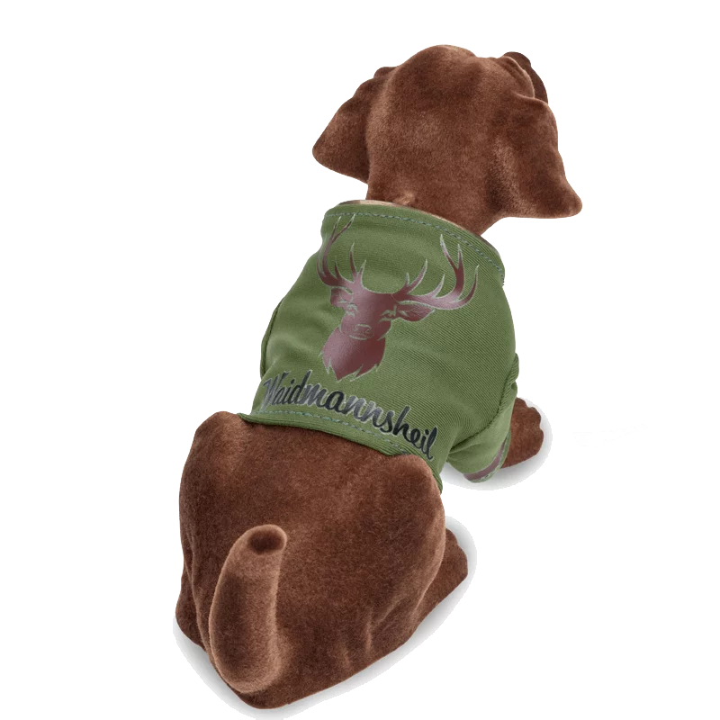 Der Wackeldackel trägt ein grünes Shirt mit Hirschkopf und 'Waidmannsheil bedruckt, an seinem Halsband befindet sich ein Anhänger mit einem kleinen Hirschkopf. Der neue Jäger-Wackeldackel ist hochwertig produziert und detailreich schön geformt.